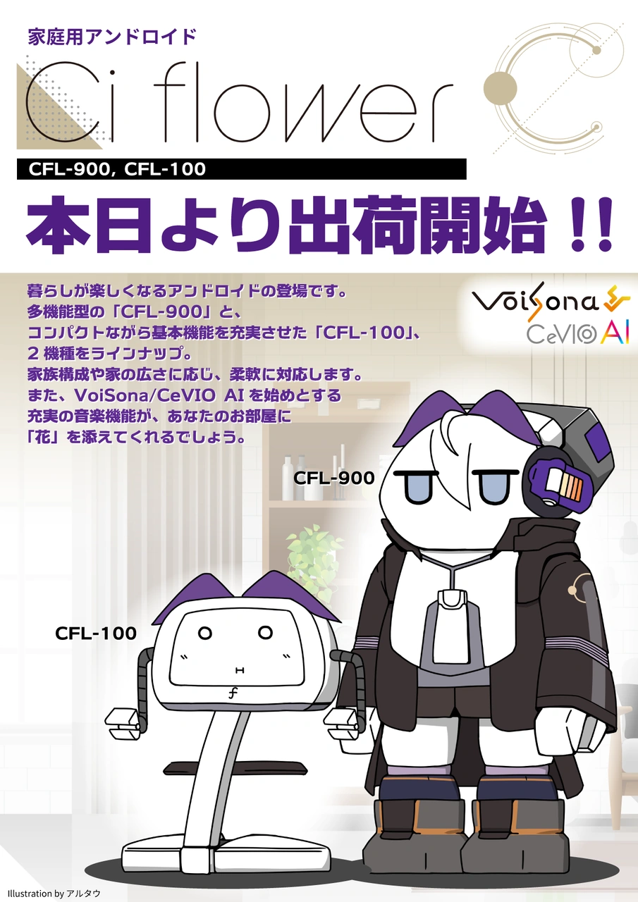 For April Fool's Day 2024, the characters CFL-900 and CFL-100 took over Ci flower's Twitter page for a day.[31] The characters are state-of-the-art androids equipped with a variety of advanced features that can be immediately useful in the home. CFL-100 is the easy to use model, while CFL-900 is the multifunctional model. Merchandise, such as acrylic stands and stickers of the characters, were released in the official Ci flower store the same day.[32]