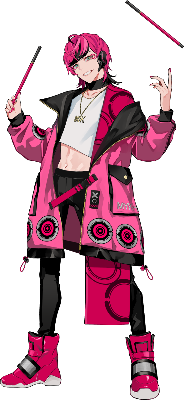 MYK-IV is an android with the appearance of an eighteen-year-old man. He has magenta colored hair with black tips on his bangs. His pupils are green and pink with yellow rings. Around the corners of his eyes is a magenta circle. His fingernails are painted hot pink. MYK-IV wears a white crop top cut at an angle, form-fitting black pants, and a bubblegum colored coat. His coat has large pockets on the hips, a black hem, a silver and magenta circle pattern, a belt that connects both sides together. His chunky sneakers are wine red with white soles and black and sliver straps. His accessories consist of a black headset, black choker, gold chain necklace with a “MYK” charm, and wine red drumsticks with black tips.